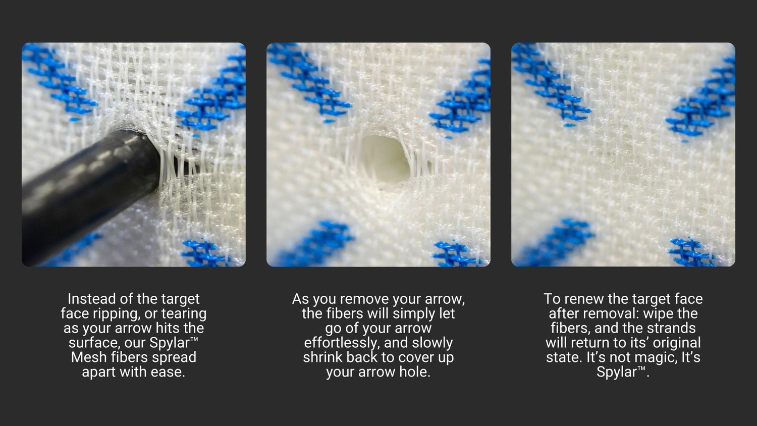 As the innovators of mesh-facing targets, we made sure that our Spylar™ Mesh is the best of the best, having the strength to handle the fastest bows on the market; all with an effortless arrow pull for you in the end. We don't do foam blocks. We don't do bag targets. We purposefully focus on one vision, making the highest of quality targets with our exclusive Spylar™ Mesh. Which is why we continue to say, "This is all we do".